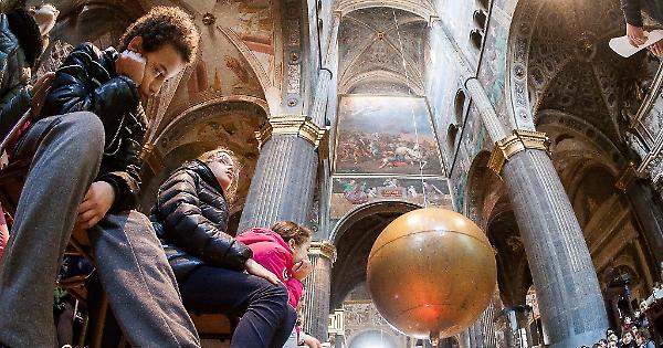 CREMONA - Cattedrale affollata, bambini delle elementari curiosi e molto attenti, insegnanti conquistati dall’esperimento, ma anche musica (Andrea Seghezzi al violino; Niccolò Toscani al violoncello; Alessandro Romani alla chitarra, voci narranti Valentino Lui e Matteo Dall’Asta, tutti dell’Aselli) ed immagini sullo schermo. Nella mattinata di mercoledì 18 marzo, in duomo, è stato ripetuto il famoso esperimento del pendolo di Foucault.