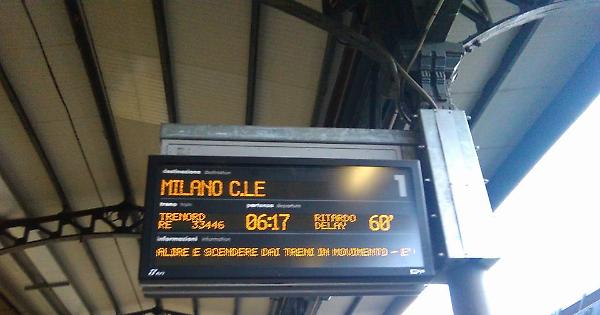 Il cartello segnala il ritardo di un'ora sulla linea per Milano