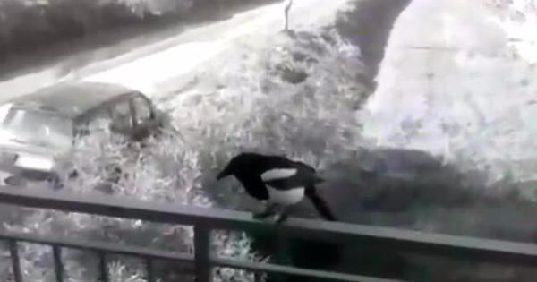 La gazza ladra catturata sopra una balaustra