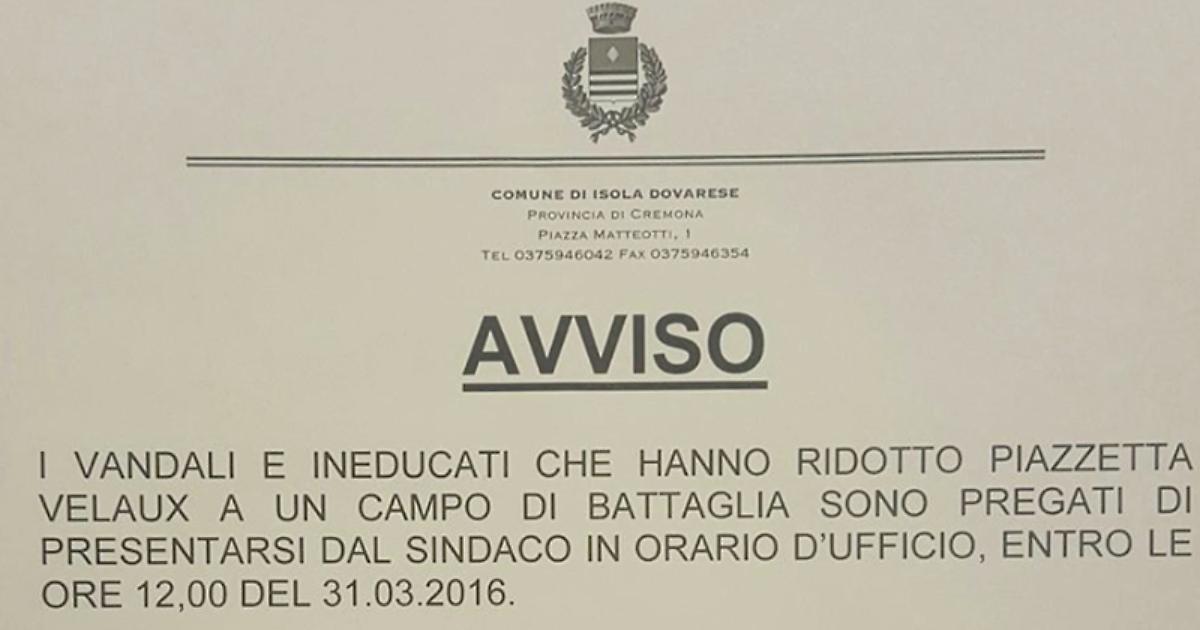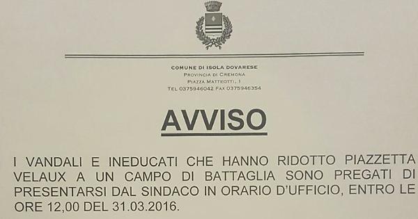 ISOLA DOVARESE — Le strutture e i giardinetti di piazza Velaux divelti, imbrattati e sporcati. Il sindaco Gianpaolo Gansi non ci sta e ‘convoca’ gli incivili facendo pubblicare un ultimatum: «I vandali e gli ineducati che hanno ridotto la piazzetta a un campo di battaglia sono pregati di presentarsi dal sindaco in orario d’ufficio entro le 12 del 31/3 (oggi, ndr). In caso contrario sarà sporta denuncia contro ignoti».