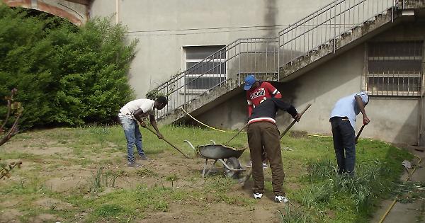 Alcuni migranti alle prese con l'orto sociale
