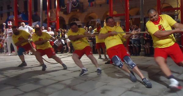 SORESINA — Il Palio non cambia padrone, e non cambia rione. Resta a S. Rocco. I ‘fidelen’, in discreta scioltezza, si aggiudicano l’edizione numero due della sfida e lo fanno in un tripudio di bandiere, cori, lacrime ed emozioni. Ha vinto un quartiere ma in realtà ha vinto tutta la città, perché così ‘calda’, accesa e colorata Soresina non si vedeva da un pezzo. La notte si è illuminata a partire dalle 20.30 con le sfilate dei quattro rioni, a modo loro tutte strepitose. Con la restituzione del Palio, e il commovente minuto di silenzio in memoria di Alaga Babic, l’operaio morto poche ora prima in Latteria, sono iniziate le gare, e fin dalle prime battute si è capita subito che S. Rocco aveva una marcia in più. Ne ha vinte tre su cinque (tiro alla fune, corsa dei sacchi, briscola) staccando gli ‘ernani’ di S. Francesco e i ‘singhen’ della Madonnina secondi a pari merito. Distanti i ‘miliunari’ di Santa Croce. Per la Pro loco, organizzatrice dell’evento, è stato un successone. Traboccante d’entusiasmo e popolata fino a tardi da contradaioli di tutte le età, la città ha proposto ai tantissimi spettatori accorsi in piazza il suo volto più bello. Soresina piccola Siena? Per una notte, sì.