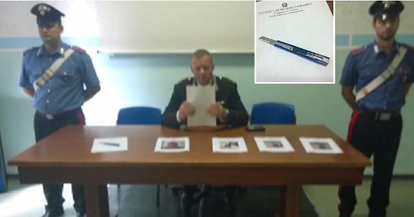 La conferenza stampa sull'arresto e nel riquadro il taglierino