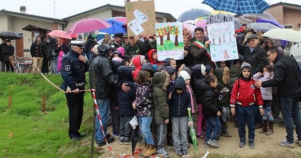 CREMONA - Bosco bagnato, bosco fortunato: 555 alberi piantumati, tanti quanti sono i bambini nati a Cremona nel 2015: questo il primo lotto appunto del ‘bosco dei nuovi nati’ realizzato in via Bredina (quartiere Sant’Ambrogio) ed inaugurato martedì 22 novembre: un momento di festa e di gioia, nonostante il maltempo, che ha visto la partecipazione degli alunni della scuola primaria S. Ambrogio. I bambini, accompagnati dagli insegnanti, hanno letto poesie dedicate agli alberi e hanno portato i disegni da loro stessi realizzati per l'occasione.