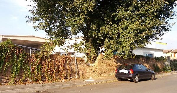 Il muro di mattoni raso al suolo e la quercia in via del Macello