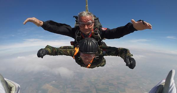 CREMONA - Come aveva annunciato, Giuseppe De Grada ha festeggiato martedì 25 aprile i suoi 96 anni lanciandosi in volo con il paracadute, in tandem con un istruttore, da un aereo partito dal Migliaro. "Ho avuto un attimo di esitazione per il vento gelido, ma poi è andato tutto bene". Sono state le prime parole dell'ex parà subito dopo aver toccato terra. Lo attendevano ai lati della pista dell'aeroporto un folto gruppo di familiari, amici ed ex commilitoni.