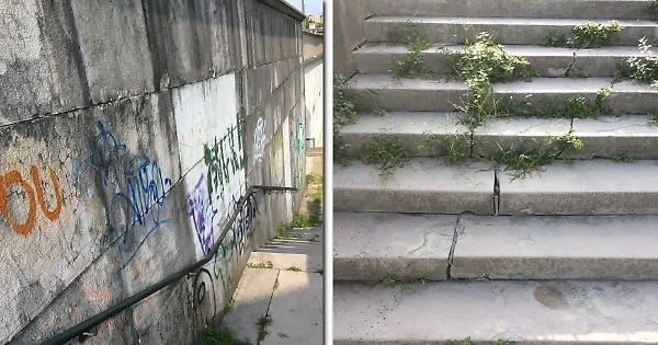 CREMONA - E’ una delle più pregevoli opere architettoniche del Ventennio fascista. Ma è anche un esempio di incuria con i suoi pericolosi gradini rotti, le erbacce e i muri imbrattati. Così si presenta il cavalcavia di accesso al cimitero monumentale, da tempo lasciato andare. «Una vergogna», è il commento di chi, quotidianamente, si reca a piedi al campo santo. E il degrado balza all’occhio già percorrendo il marciapiede di sinistra del cavalcavia, dopo aver attraversato via Dante. Asfalto sconnesso, ‘pezze’ di asfaltatura fatte in precedenza, erbacce. «Bisogna fare molta attenzione, perché il rischio è di farsi del male e se ti va bene, ti sloghi una caviglia», dicono alcuni habitué. Arrivati in cima al cavalcavia, il rischio più serio lo si corre scendendo (e salendo) i gradini. «E’ vero che c’è il corrimano, ma non sai dove mettere i piedi. Se piove, rischi di scivolare sull’erba incolta. Soprattutto, non c’è un gradino che si salvi. Sono tutti crepati, alcuni addirittura spezzati. Qui il rischio che si corre è di rompersi una gamba. E poi tutti quegli orrendi scarabocchi sui muri. E’ indecoroso per un cimitero». Da qui l’appello all’amministrazione comunale «di sistemare il cavalcavia. Non stiamo andando allo stadio, ma al cimitero. Ci vorrebbe più rispetto da parte del Comune».