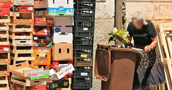 Una donna rovista tra i rifiuti del mercato di Cremona