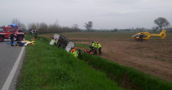 TRIGOLO - Due morti e otto feriti, uno dei quali in gravi condizioni. E’ il bilancio dello spaventoso incidente avvenuto alle 14 di domenica 15 aprile alle porte di Trigolo, lungo la provinciale per Soresina. Un vecchio furgone Ducato sul quale viaggiavano due egiziani e otto richiedenti asilo, tutti residenti a Soresina, è uscito di strada all’altezza di una curva e si è ribaltato in un fosso. Il conducente, un 32enne egiziano, è morto sul colpo; decesso immediato anche per uno dei trasportati, un 23enne senegalese, che viaggiava nel retro del veicolo, senza posti a sedere, senza cinture e senza finestrini. Gli altri occupanti sono stati ricoverati negli ospedali di Lodi, Cremona e Crema: il più grave, trasportato in elicottero proprio al Maggiore di Crema, è in prognosi riservata.