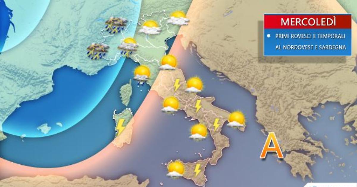Tra mercoledì e giovedì arriverà una perturbazione dal Mediterraneo occidentale. L'alta pressione in rinforzo sul Baltico contrasterà con un'ampia ruota di bassa pressione di provenienza atlantica. Lo spostamento dei massimi sull'Europa nordorientale consentirà a un fronte nuvoloso di raggiungere le nostre regioni, coinvolgendo in particolare i versanti occidentali italiani. Piogge e qualche temporale, talora di forte intensità, potranno interessare Nord Ovest, Sardegna e Toscana per poi estendersi a Lazio e Sicilia. “Sul resto della Penisola la situazione rimarrà per il momento invariata” - concludono da 3bmeteo.