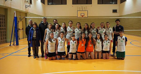Matteo Atzei di EnerService, Tania Secchi e Mauro Platè del Comune di Cremona, Francesco Gerevini della Polisportiva S.Ilario con la squadra del Minivolley Under 14 allenata da Gabriele Pantaleo