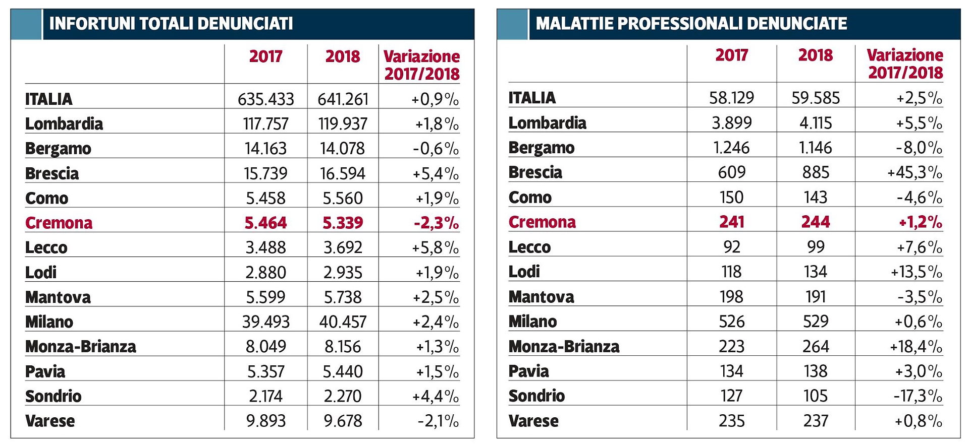 Ma torniamo ai dati. Se in provincia di Cremona gli infortuni denunciati calano, di pari passo si registra l’incremento delle malattie professionali. Si tratta di un aumento molto lieve, dell’1,2 per cento. Decremento, a Cremona, anche per quel che concerne i dati relativi agli infortuni mortali. Nel corso del 2018 in provincia sono stati 5, tre in meno rispetto all’anno precedente.