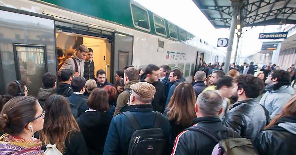 Pendolari cremonesi in stazione alla salita sul treno per Milano