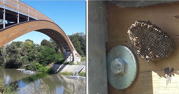 ROBECCO D'OGLIO (10 settembre 2019) - Passerella ciclopedonale sul fiume Oglio tra Monasterolo e Monticelli invasa dalle vespe. E tra i cicloamatori cremonesi e bresciani sale la preoccupazione. «Il ponte regala una vista magnifica – racconta un 27enne appassionato di bicicletta del territorio – anche se ieri mattina ho faticato ad attraversarlo perché c’erano vespe ovunque: ne ho viste parecchie muoversi lungo le assi in legno vicino al corrimano e tra la struttura e i sostegni in cemento ho chiaramente notato quattro nidi. Così senza pensarci due volte ho subito contattato il Parco Oglio Nord per segnalarne la pericolosità». Sensibile al problema il presidente Luigi Ferrari, che commenta: «Mi sono subito attivato per contattare le guardie forestali in modo da intervenire prontamente. Parliamo di insetti potenzialmente pericolosi per l’uomo: pedoni o ciclisti che soffrono di allergia alle loro punture possono infatti rischiare di andare in choc anafilattico. Quindi è importante risolvere il problema in modo tempestivo».