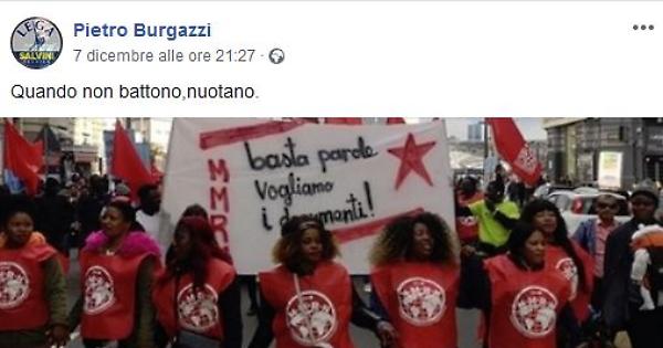 CREMONA (11 dicembre 2019) - Bufera su Pietro Burgazzi, segretario della Lega cittadina, per il post sul suo profilo Fb dove condivide l'articolo di RI (Rassegne Italia) con fotografia della manifestazione di donne di colore in corteo definite "sardine nere per difendere i diritti di clandestini e immigrati". Ma è soprattutto il commento social di Burgazzi che sta scatenando le reazioni di indignazione: «Quando non battono, nuotano».