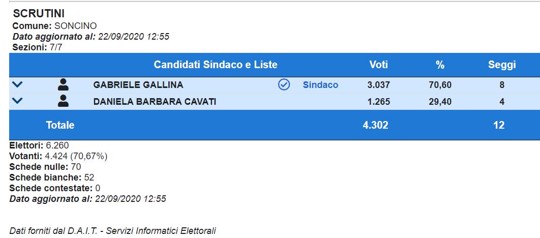 SONCINO (22 settembre 2020) - I dati ufficiali arriveranno tra circa un'ora, ma Gabriele Gallina sarà nuovamente sindaco di Soncino. Netto il vantaggio sulla sfidante Daniela Cavati.