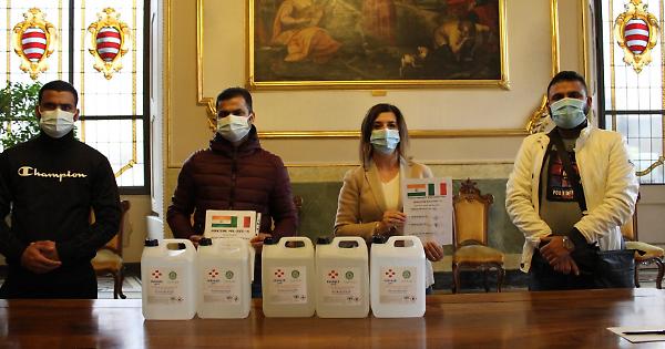 CREMONA (23 ottobre 2020) – Ancora un gesto di solidarietà da parte della comunità indiana in questo momento particolarmente difficile. Questa mattina, in Sala della Consulta di Palazzo comunale, accolti dall'assessore Simona Pasquali, i rappresentanti della Indian Community Sewa Society Italy Sunny Bagga, Singh Balwinder e Kumar Sanjeev, hanno donato alla comunità cremonese cinque taniche di gel igienizzante che sono state poi portate alla Protezione Civile per la successiva distribuzione.