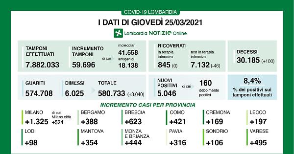 CREMONA (25 marzo 2021) - Sono 169 i casi positivi conteggiati in provincia di Cremona nelle ultime 24 ore: ieri erano stati 195. In Lombardia, a fronte, a fronte di 59.696 tamponi effettuati, sono 5.046 i nuovi positivi (8,4%). I guariti/dimessi sono 3.040.