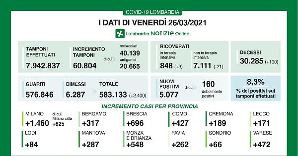 CREMONA (26 marzo 2021) - Nell'arco di due giorni le vittime cremonesi del Covid sono aumentate di 14. Nelle ultime 24 ore in provincia di Cremona sono stati registrati 189 casi positivi al Coronavirus. In Lombardia, a fronte di 60.804 tamponi effettuati, sono 5.077 i nuovi positivi (8,3%). I guariti/dimessi sono 2.400