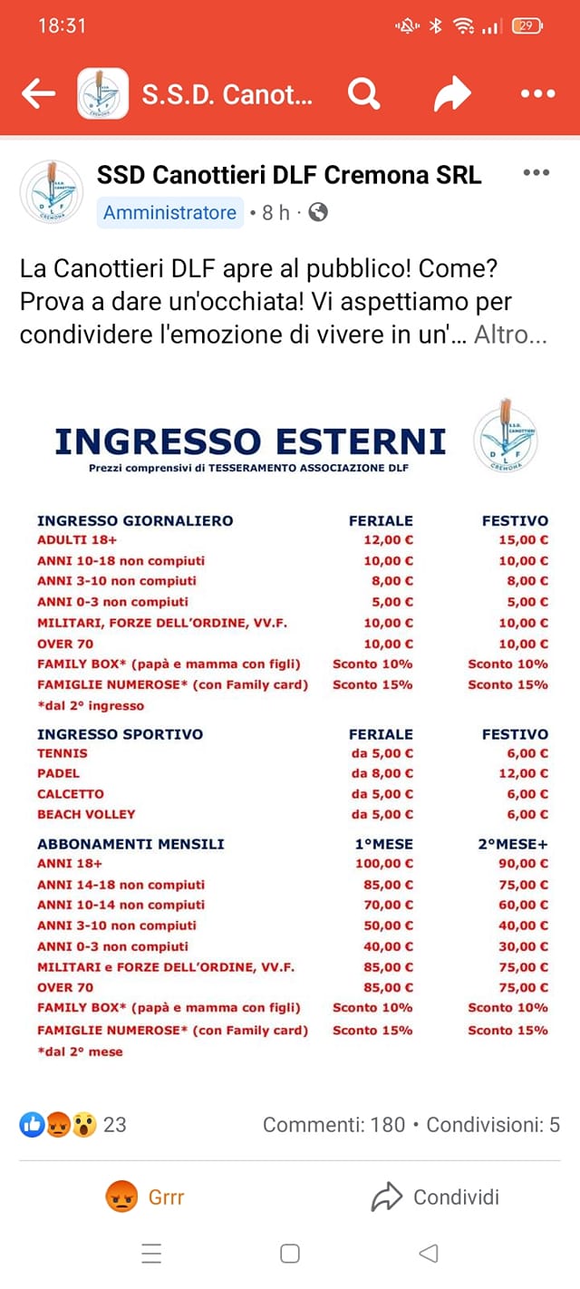 Secondo la tabella pubblicata, l’ingresso giornaliero alla «Ferro» costerà per gli esterni maggiorenni 12 euro nei feriali e 15 nei festivi. Ticket ridotti per i ragazzi dai 10 ai 18 anni (10 euro) e per i bambini, a seconda dell’età. Sconti agli over 70, alle famiglie e agli appartenenti alle forze dell’ordine. Sono previsti anche ingressi sportivi con prezzi che variano dai 5 ai 12 euro a seconda della disciplina che si intende praticare e del giorno festivo o feriale. Ma quello che ha suscitato le reazioni più arrabbiate sono gli abbonamenti mensili per gli esterni: 100 euro il primo mese e 90 per i mesi successivi per gli adulti. Anche per questi abbonamenti sono previste riduzioni e sconti per i ragazzi, i bambini, i militari, gli over 70 e le famiglie. Con 370 euro, quindi, è possibile passare la stagione estiva alla Canottieri Dlf. E in molti hanno sottolineato che, a questo punto, diventa svantaggioso pagare la quota annuale: 513 euro per il 2022. Il post in poche ore ha raccolto oltre 200 commenti, molti dei quali furibondi.