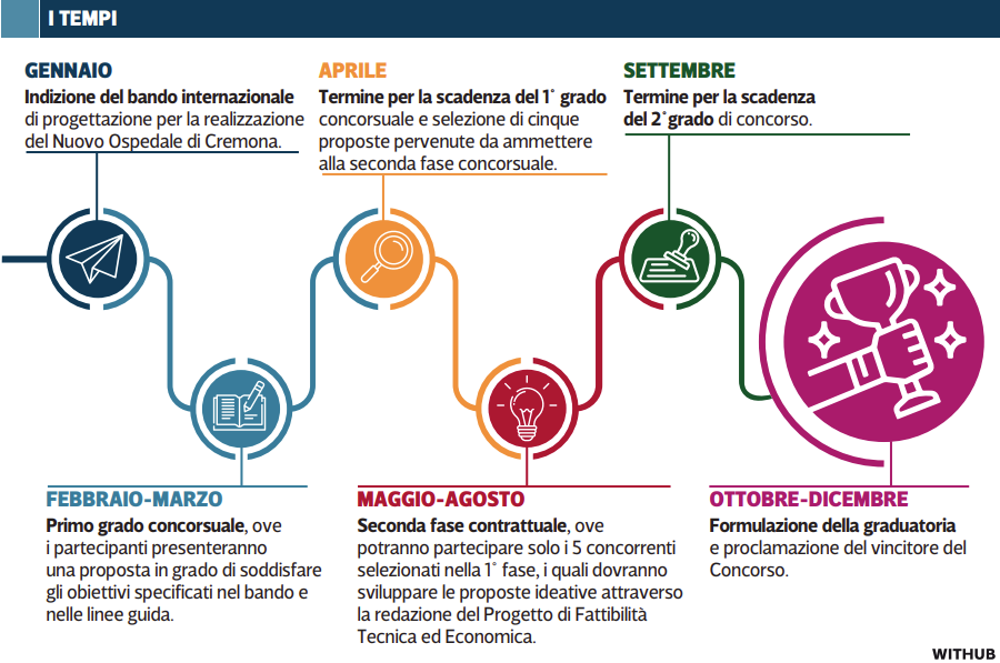 Maurizio Bracchi ha presentato il progetto facendo il punto sugli aspetti più tecnici e sui prossimi step: «L’ospedale del futuro sarà uno spazio accogliente e rasserenante, flessibile e modulare, tecnologico, connesso e aperto alla città. Sarà sempre più un polo dedicato alla cura di malattie gravi e all’esecuzione di procedure complesse. Potrà contare su 600 posti letto. I trattamenti di routine — ha aggiunto — e la cura preventiva saranno distribuiti attraverso strutture di vicinato diffuse sul territorio. All’interno di questo ecosistema interconnesso saranno inserite anche le cure domiciliari, grazie a dispositivi diagnostici intelligenti collegati con centrali di controllo, attraverso le quali i medici potranno monitorare lo stato di salute in tempo reale». Il bando per la realizzazione del nuovo ospedale di Cremona sarà indetto nel mese di gennaio 2023. Le proposte saranno raccolte entro il mese di aprile: ne saranno selezionate cinque, che saranno ammesse alla seconda fase del concorso. La graduatoria finale sarà pubblicata tra ottobre e dicembre, con la proclamazione del vincitore.