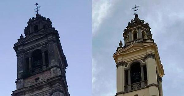 MONTODINE - È terminato il restauro conservativo del campanile della chiesa parrocchiale di Santa Maria Maddalena, il più alto del Cremasco e uno dei più imponenti della Provincia, con i suoi 60 metri di altezza compresa la croce sommitale. Si tratta anche di uno dei più significativi sotto il profilo architettonico e artistico, soprattutto per la particolare conformazione della sommità, costituita da un tempietto ottagonale scandito da colonne corinzie e concluso da una cupoletta ornata di fastigi in pietra di eccezionale fattura. In questi giorni si sta togliendo il ponteggio e già appare il risultato del lungo lavoro svolto.
