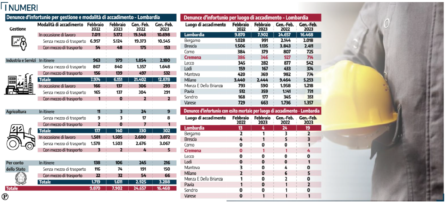 Perboni osserva: «È essenziale mantenere alta la guardia sulla sicurezza e la salute dei lavoratori. Ribadiamo la necessità di perseguire precisi obiettivi strategici, a partire dal rafforzamento del sistema ispettivo di Ats e Itl, in modo da garantire un numero adeguato di ispettori e di controlli con sanzioni per chi non rispetta la legge. Riteniamo importante, poi, incentivare dinamiche virtuose di premialità per le aziende che fanno della salute e della sicurezza un punto centrale della propria organizzazione del lavoro: l’introduzione dell’apposita patente porterebbe al riconoscimento dei meriti e alla penalizzazione delle aziende inadempienti, anche mediante l’esclusione perpetua dal sistema degli appalti pubblici e privati».