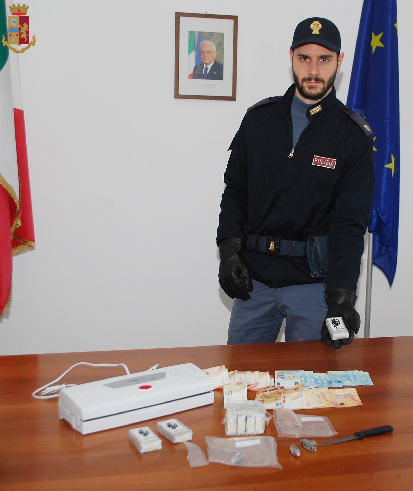 La perquisizione del suo appartamento portava al rinvenimento di hascisc, suddiviso in diversi panetti e alcuni ovuli pronti per essere venduti al dettaglio, per un quantitativo complessivo di circa 1 chilogrammo nonché di apparecchiatura per il confezionamento sotto vuoto dello stupefacente e di denaro ammontante a circa 900 euro in banconote di vario taglio considerato provento dello spaccio. Il giovane veniva trattenuto presso le camere di sicurezza del Commissariato in attesa dell’udienza direttissima.