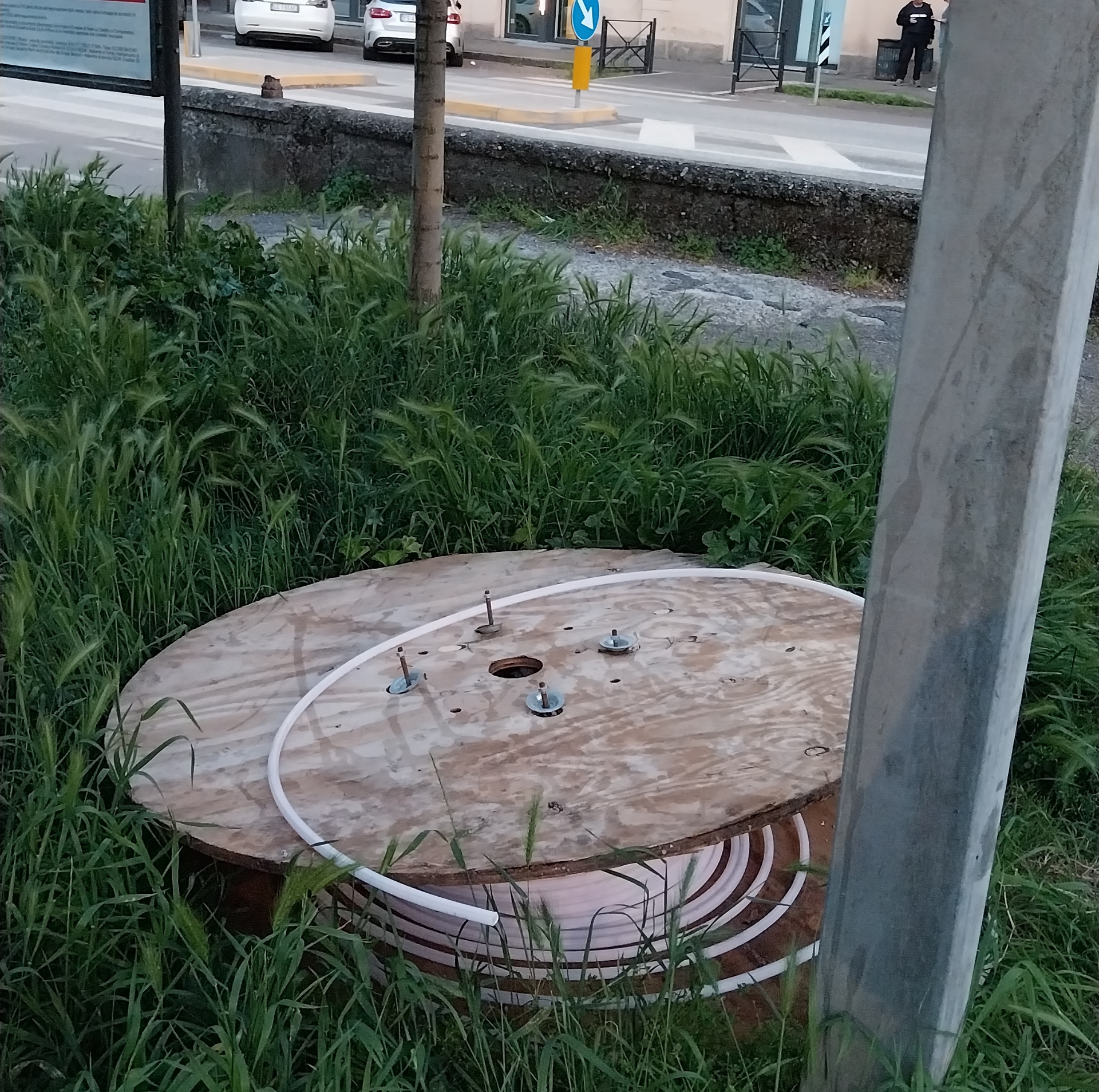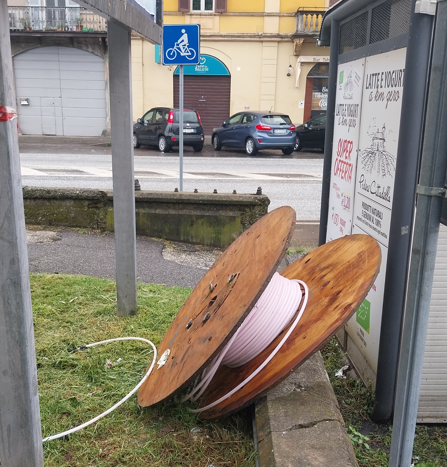 Sempre a pochi metri dal comando poi, giace un grande rocchetto di legno con ancora avvolto un cavo che sembra fibra ottica. Forse abbandonato dopo qualche cantiere. La bobina era nell’erba alta dietro la macchina che offre latticini freschi. Dopo l’intervento di sfalcio è ancora lì, appoggiata al muretto.