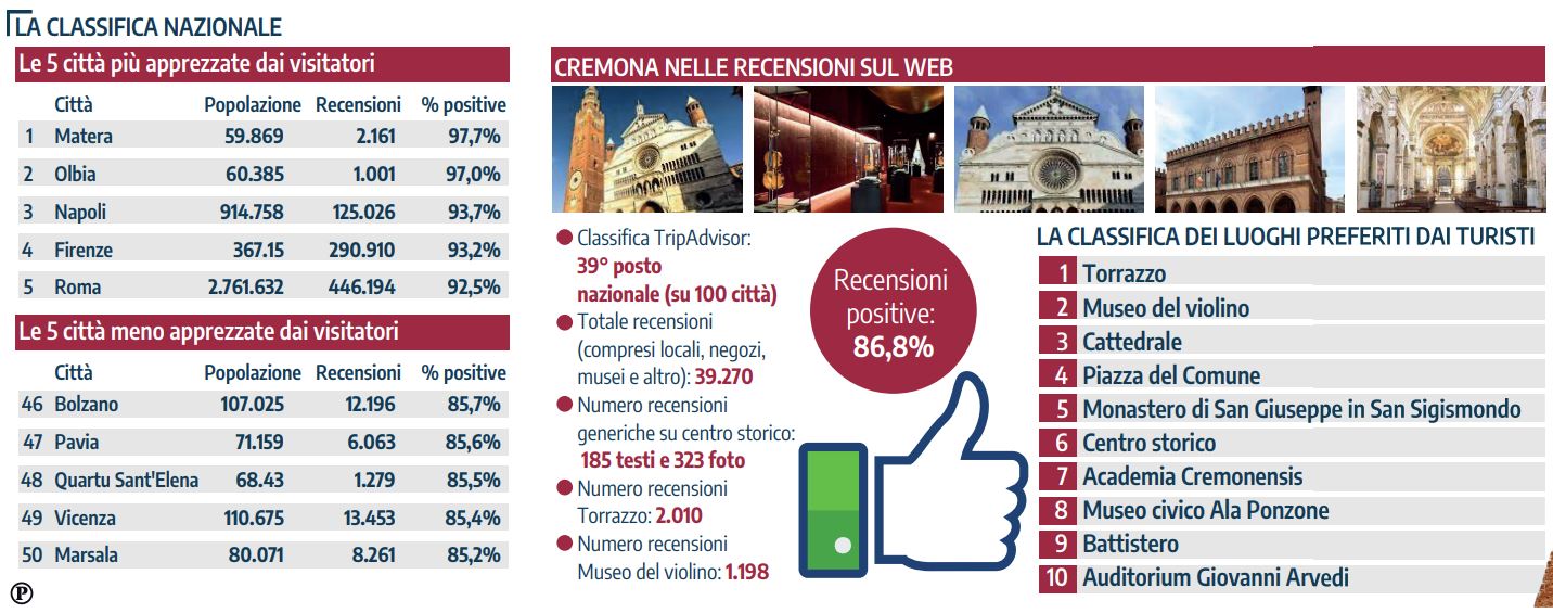 CREMONA/CREMA - La ripresa del turismo va di pari passo con il gradimento, che è massimo: Cremona e Crema, stando alle recensioni raccolte su Tripadvisor che è il principale portale web sui viaggi, sono entrambe da cinque stellette. Ovvero hanno raccolto recensioni ottime, seppure con qualche rara eccezione che può essere da stimolo per migliorare ulteriormente l’accoglienza. Partiamo da un dato di fatto attestato proprio dal sito web e forum, in collaborazione con Preply: fra le 100 città più popolose analizzate e con almeno 500 recensioni, Cremona è al 39esimo posto nazionale con l’86,8% di giudizi positivi. In Lombardia meglio di Cremona fanno solo Brescia (17esimo posto con l’89,1% di recensioni positive); Varese (posizione 26 e 88% di buoni giudizi) e Bergamo (posizione 28 e 87,9% di recensioni positive). Giusto per avere un’idea sul resto dell’Italia, la più apprezzata è la città dei sassi, ovvero Matera. Mentre all’ultimo posto c’è Pescara.