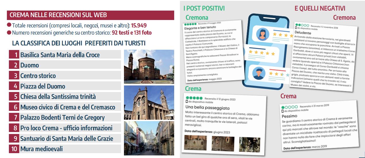 Ai turisti piace molto anche Crema, che di recensioni su Tripadvisor ne può vantare circa 16mila. «Una città unica e romantica» scrive fra le altre cose un utente, che però è proprio cremasco e dunque forse un po’ di parte. Anche in questo caso non mancano critiche o suggerimenti. C’è ad esempio chi lamenta l’eccessiva presenza di biciclette che sfrecciano lungo il corso, o chi sottolinea che il centro storico «non vale quello delle altre principali città lombarde, tanto che la chiesa di maggiore rilievo, Santa Maria della Croce, si trova a due o tre chilometri». Parlando proprio di centro, sono 86 le recensioni eccellenti o molto buone. La prima che viene proposta agli aspiranti visitatori è parecchio lusinghiera, perché intitolata: «La città della bellezza e cortesia».