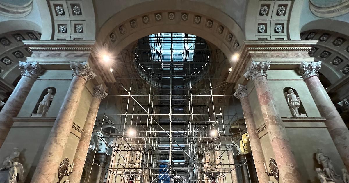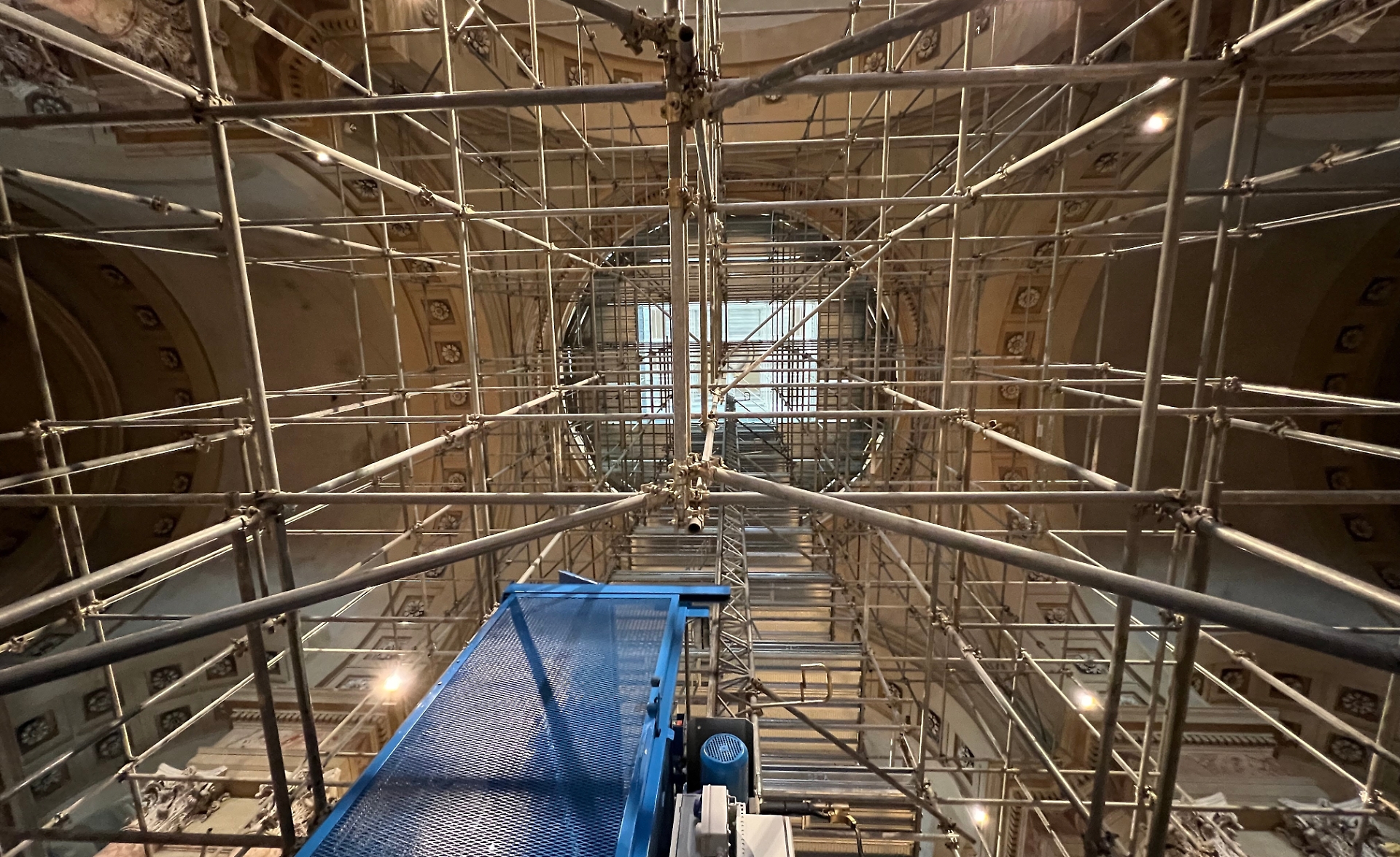 L' imponente e spettacolare impalcatura interna nel Duomo di Santo Stefano