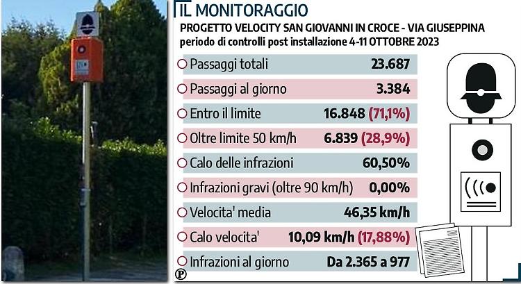 SAN GIOVANNI IN CROCE - Un calo delle infrazioni del 60% e un calo della velocità media di quasi il 18%. Sono incoraggianti i dati del monitoraggio in via Giuseppina a San Giovanni a seguito dell’installazione del Velocity, il dissuasore di velocità. Il monitoraggio del traffico legato alla campagna ‘Attenta-mente’, era iniziato con l’analisi dei passaggi veicolari con le relative velocità ad inizio maggio, senza nessun dissuasore di velocità. I dati raccolti, hanno mostrato che solamente una macchina su quattro rispettava il limite dei 50 chilometri orari previsto dal codice della strada su via Giuseppina, strada di proprietà comunale. Da lì la scelta dell’amministrazione comunale di installare un nuovo dissuasore che è entrato in servizio il 29 settembre scorso.