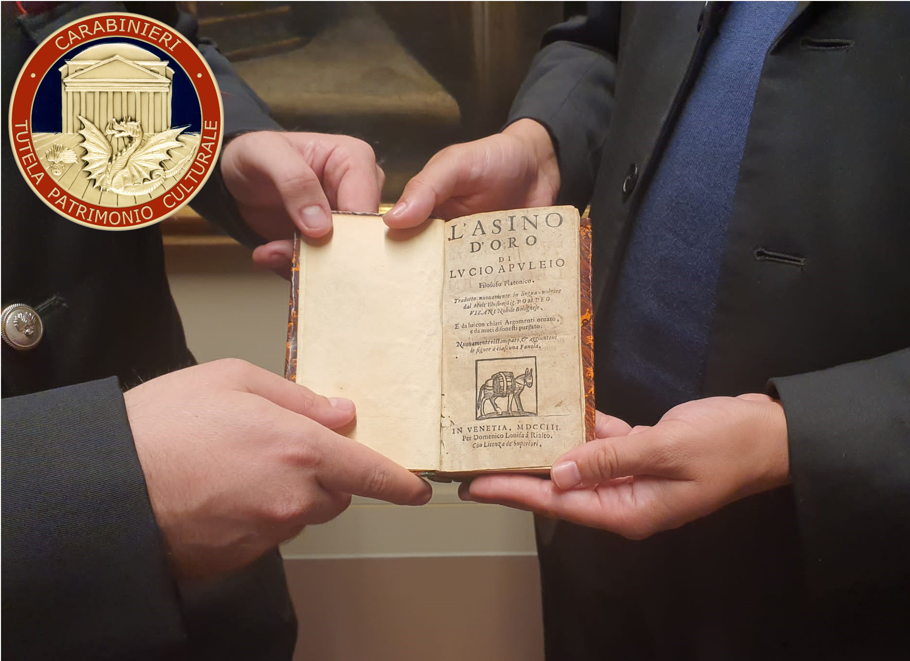 CREMONA - I militari del Nucleo di Udine del Comando Carabinieri Patrimonio Culturale, hanno restituito al direttore della biblioteca del seminario vescovile Santa Maria della Pace di Cremona, un prezioso volume dal titolo “L’asino d’oro di Lucio Apuleio filosofo platonico” scritto dal poeta cartaginese Lucio Apuleio (125 – 170 d.c.) per “Domenico Louisa à Rialto 1703”. Si tratta di un esemplare molto raro in quanto unica versione dell’opera edita dallo stampatore e presente nel sistema bibliotecario nazionale con “sole tre registrazioni e nelle biblioteche europee in numero assai ridotto”. Libro molto noto nella letteratura latina, è conosciuto anche con il nome di “Metamorfosi” nel quale si narra la celebre storia di Amore e Psiche, più volte ripresa nelle rappresentazioni artistiche fin dai tempi antichi.