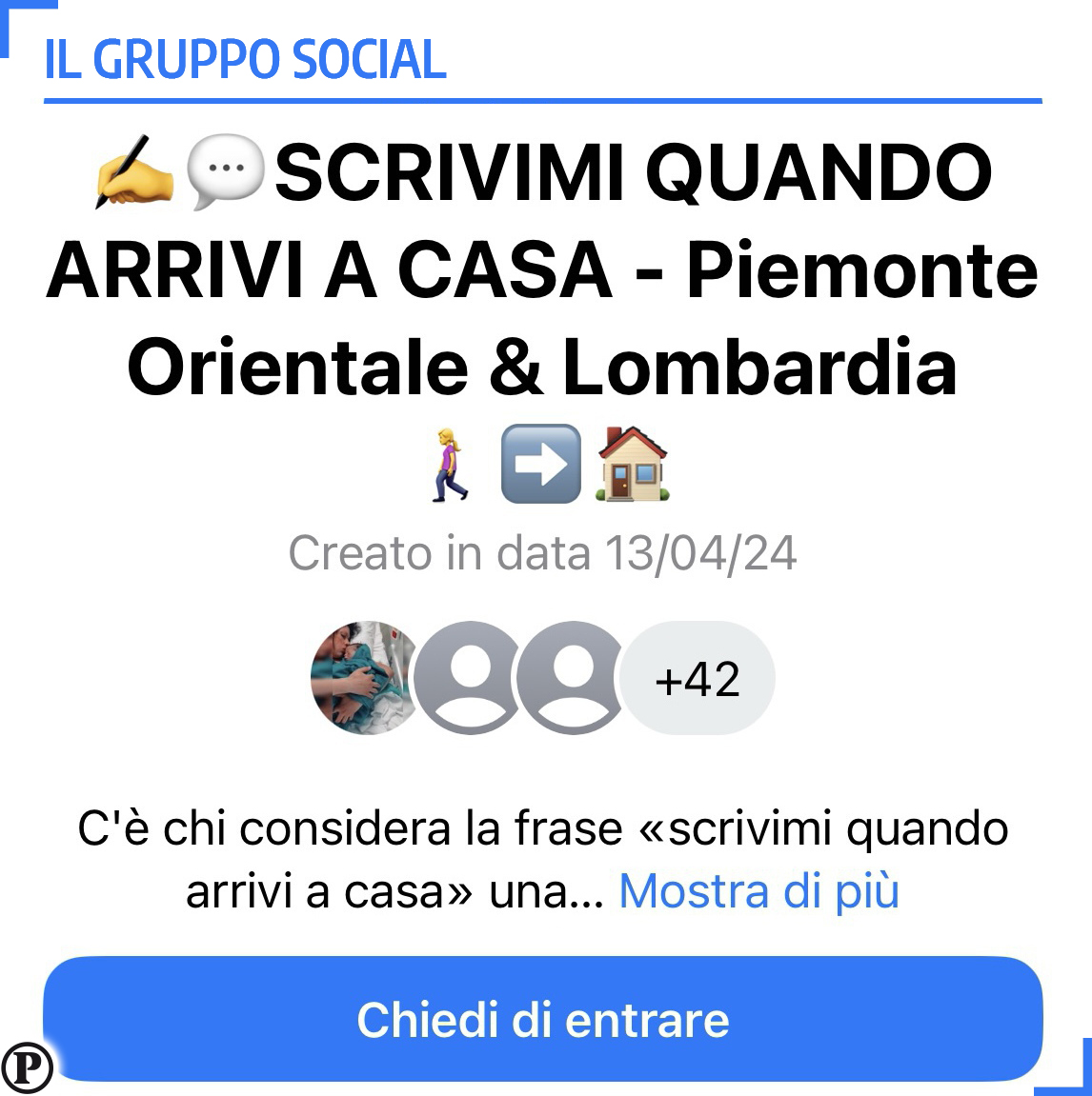 «In una settimana c’è già chi ha raccontato che il tal giorno deve tornare sola al parcheggio e chiesto la possibilità di videochiamare durante quei cinque minuti per sentirsi più tranquilla – conclude Laura –. Noi saremo le referenti, ma tutte contribuiranno alla causa. Naturalmente si tratta di un gruppo per sole donne e prima di accedere sarà richiesta una piccola presentazione. L’obiettivo è anche ricordare i canali ufficiali per chiedere aiuto. E poi sensibilizzare e scambiarci consigli per la sicurezza». Secondo l’Istat il 49% delle donne non si sente sicura ad uscire sola di sera, anche se si tratta solo di qualche passo nel quartiere vicino a casa: quasi una su due, quindi, ha paura.