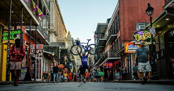 Andrea Devicenzi alza in segno di trionfo la sua bicicletta a New Orleans