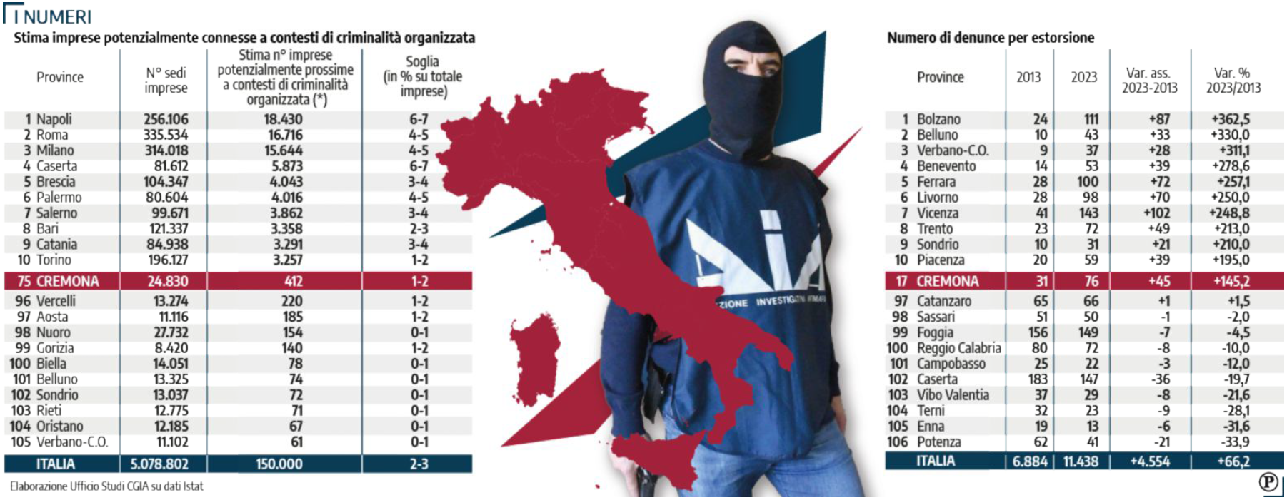 CREMONA - Su 24.830 imprese della provincia di Cremona, 412 sono «potenzialmente prossime a contesti di criminalità organizzata». Le denunce per estorsione registrano un’impennata, passando dalle 31 del 2013 alle 76 del 2023 (+ 45%), collocando la provincia al 17 posto della classifica nazionale.