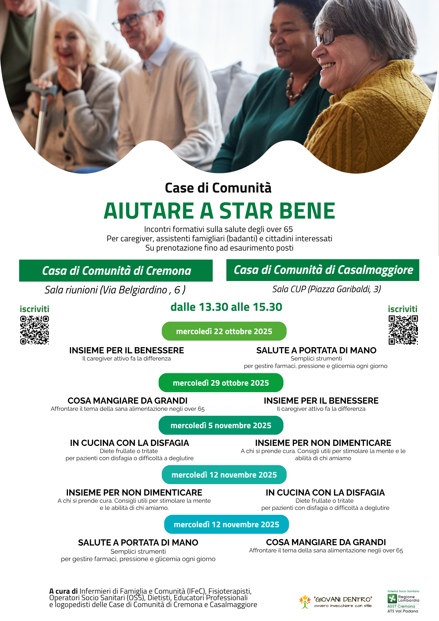 L’iniziativa è rivolta a caregiver, assistenti familiari e cittadini che desiderano approfondire temi legati alla cura, alla prevenzione e alla qualità della vita dopo i 65 anni. Per partecipare è necessario prenotare compilando il form dedicato, disponibile sul sito www.asst-cremona.it, nelle pagine delle Case di Comunità.