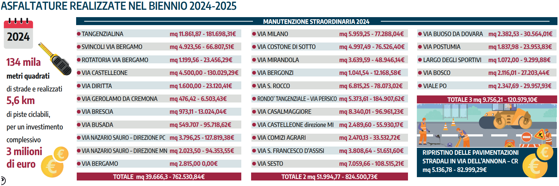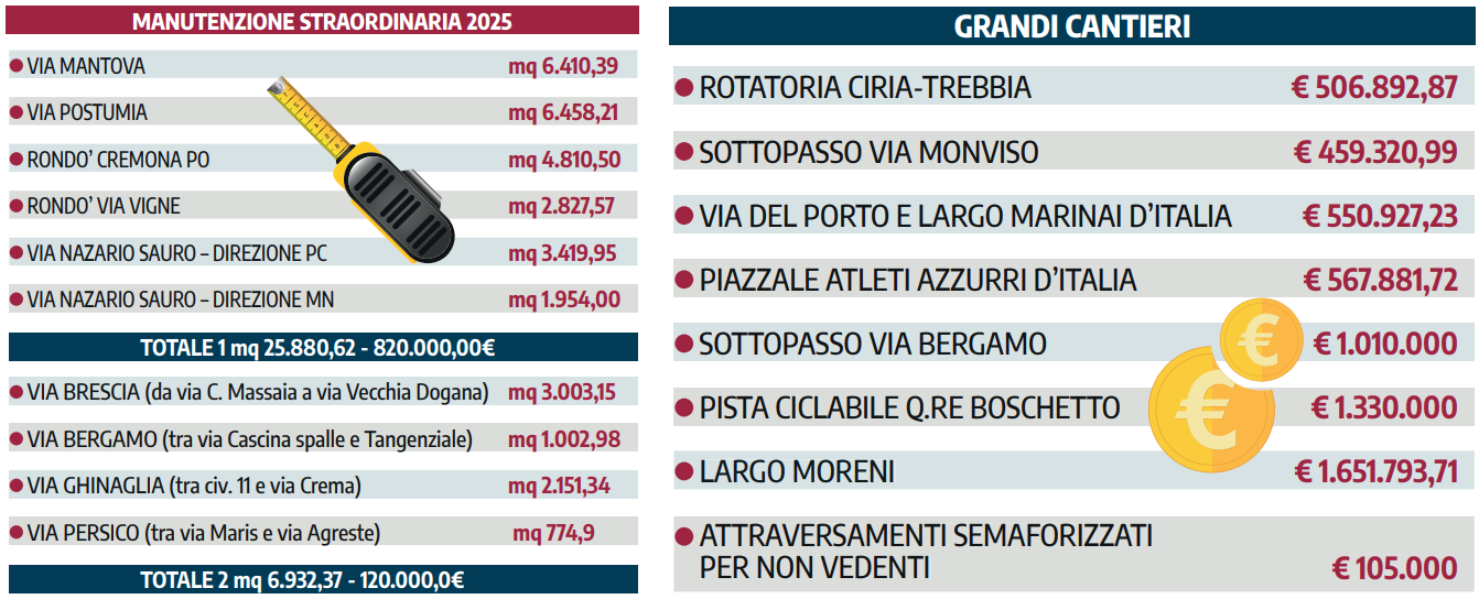 Tra le strade interessate dai ripristini più significativi figurano assi viari di grande percorrenza come la tangenziale (via Nazario Sauro), via Brescia, via Milano, via Casalmaggiore e il rondò della tangenziale con via Persico. A questo impegno si affianca un intervento diffuso di rifacimento della segnaletica orizzontale e verticale, con un investimento di circa 1,7 milioni di euro tra il 2024 e il 2025, che ha previsto il rifacimento di 1.000 attraversamenti pedonali e ciclo-pedonali e di altrettante linee di arresto, «per una viabilità più ordinata e sicura».