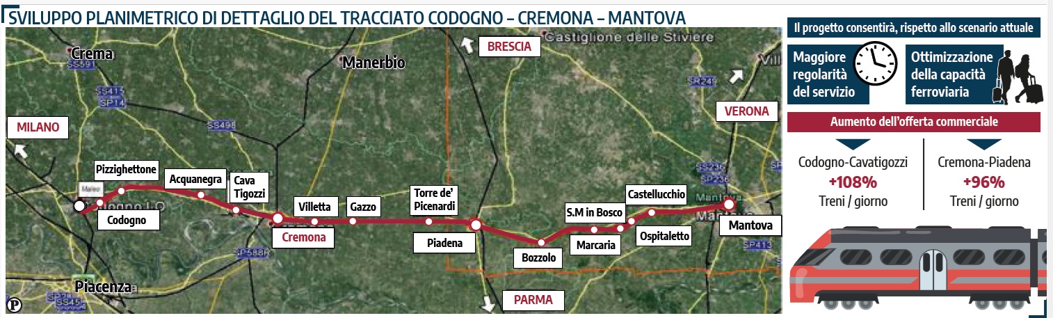 "E l’opera è prioritaria perché «è assolutamente strategica per la bassa Lombardia. Non solo per le merci e il sostegno all’economia, ma anche per le persone. Una volta ultimato, il raddoppio metterà in connessione rapida e frequente il Mantovano e il Cremonese con Milano, cuore pulsante della Lombardia. È talmente importante — sottolinea Pizzetti — che senza di esso gli investimenti di pubblico e privato sulle università cremonesi si troverebbero ad avere il fiato corto. È l’opera più importante che possiamo avere e i sindaci fanno bene a tenere alta l’attenzione, ma non siamo ancora alla soglia dell’allarme. Non gridiamo al lupo, perché in questa fase il lupo non c’è»."