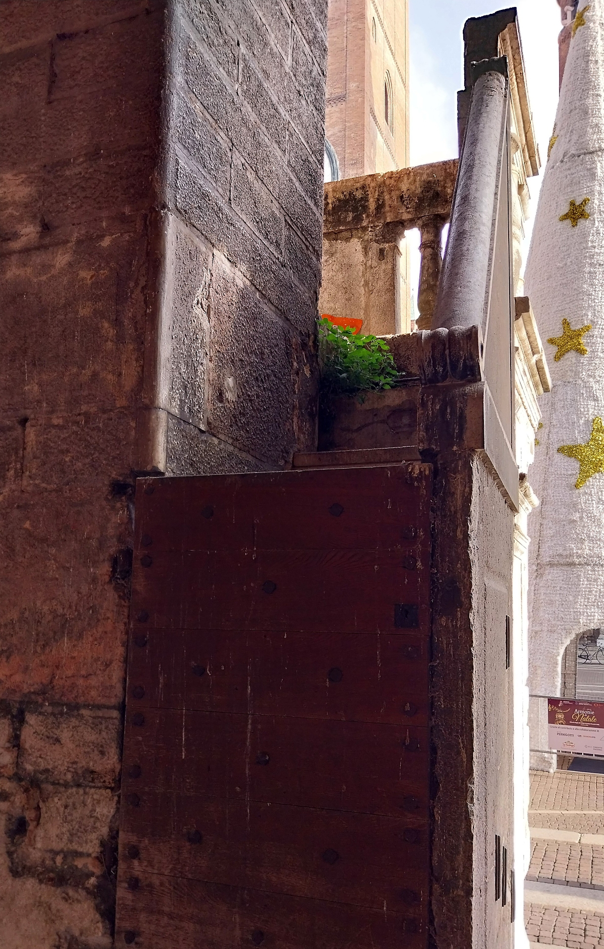 Un passante in piazza del Comune davanti all’Arengario che verrà ripulito. A destra si può osservare con chiarezza l'annerimento delle colonne su lato meridionale