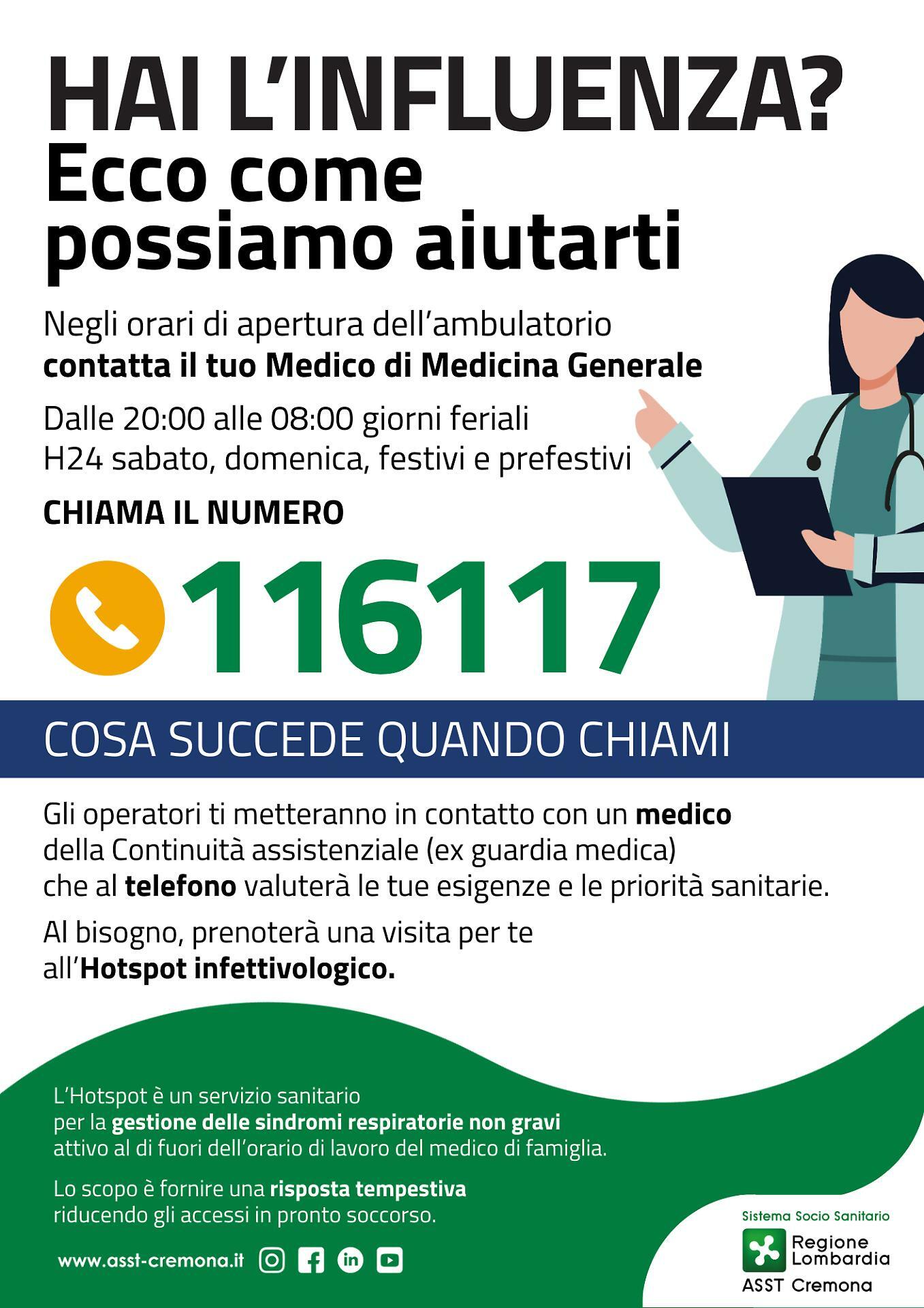CREMONA - Per affrontare il aumento dei casi di influenza, a integrazione della Continuità assistenziale (ex guardia medica), l’Asst di Cremona ha attivato l’Hotspot infettivologico, un servizio sanitario per la gestione delle sindromi respiratorie non gravi al di fuori dell’orario di apertura dell’ambulatorio del medico di famiglia che resta il primo riferimento. La continuità assistenziale (ex guardia medica) e l’Hotspot infettivologico sono servizi ai quali si accede solo su chiamata telefonica digitando il numero 116117, attivo dalle 20:00 alle 08:00 nei giorni feriali; 24 ore su 24 sabato, domenica, giorni festivi e prefestivi.