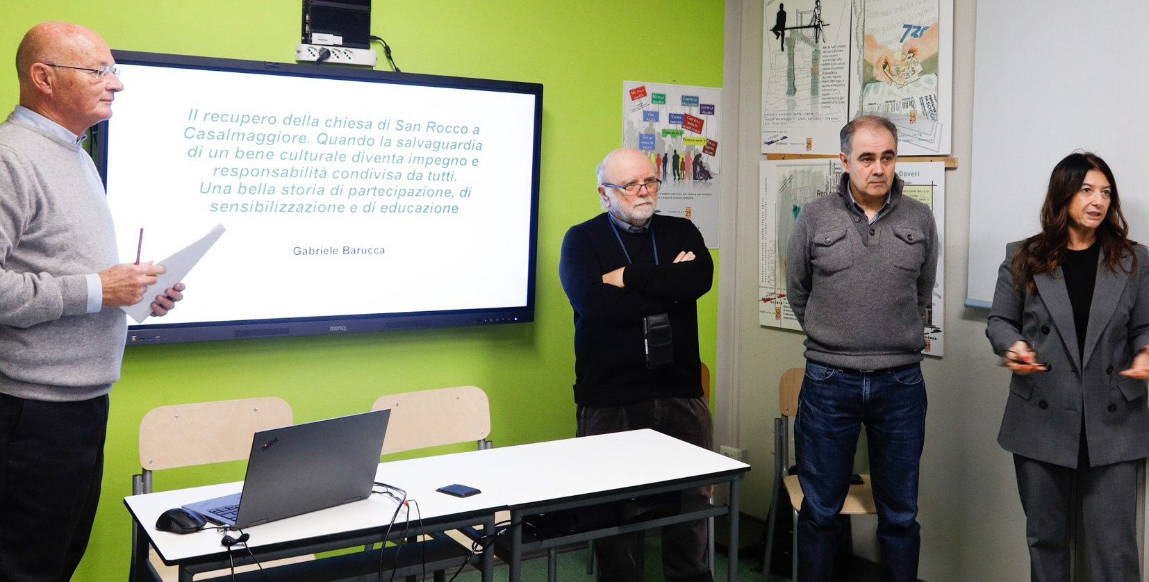 CASALMAGGIORE - «Il recupero della chiesa di San Rocco è l’esempio felice di un ‘miracolo’: ovvero come la salvaguardia di un bene culturale diventa impegno e responsabilità condivisa da tutti e tra le generazioni». Con queste parole Gabriele Barucca, già Soprintendente di Cremona, Mantova e Lodi, ha incontrato gli studenti del ‘Romani’ stamattina all’istituto per presentare il lungo e complesso progetto di restauro della chiesa a ridosso dell’argine iniziato nel 2008.