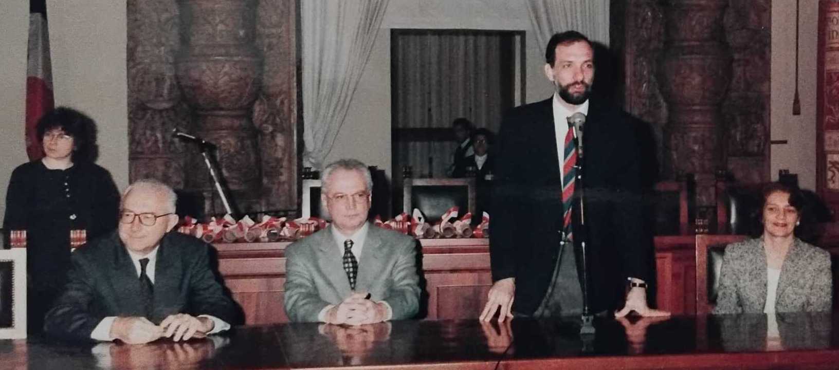 Quindi, le diapositive delle tre grandi nevicate e delle alluvioni: «Eravamo aperti anche di notte, senza orari». E nel 1999, l’Adunata nazionale degli alpini: «Ho vissuto in municipio per tre giorni». Due i ‘suoi’ presidenti della Repubblica: «Per Ciampi abbiamo organizzato la visita a palazzo comunale e il concerto in Cattedrale. Lo stesso con Mattarella, venuto apposta durante il Covid. Ero in piazza a venti metri da lui, che trepidazione: un monumento. Non funzionava il microfono ma non si è scomposto, ha parlato a braccio».