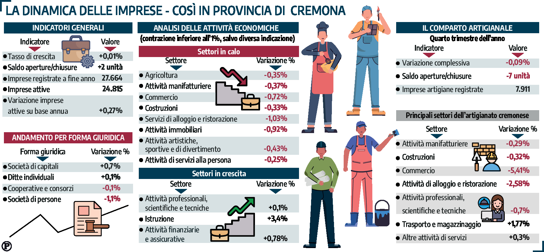 CREMONA - Il bilancio di fine anno del tessuto imprenditoriale cremonese dipinge un quadro di tenuta complessiva, ma segnato da fragilità e da un chiaro processo di trasformazione. I dati relativi all’ultimo trimestre del 2025, elaborati dal Servizio Promozione e Informazione Economica della Camera di Commercio di Cremona-Mantova-Pavia, mostrano per la provincia un tasso di crescita positivo, per un soffio sopra lo 0, per la precisione +0,01%.