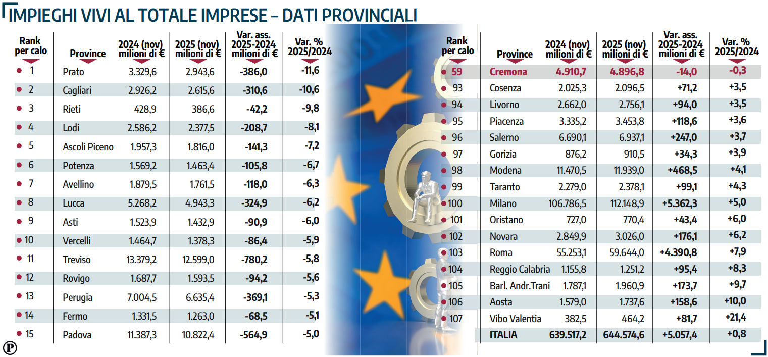 Cremona va appunto controcorrente, perché dal 2024 al 2025 il calo di impieghi vivi alle imprese è stato del -0,3%. Da 4.910,7 a 4.896,8 milioni di euro. Questi circa 14 milioni di euro in meno collocano la nostra provincia fra le 61 italiane in cui il credito bancario continua a scendere. La Cgia, nel suo report nazionale, fa un distinguo: «Le micro e le piccolissime realtà, quelle con meno di 20 addetti, hanno subito una riduzione dei prestiti pari a 5 miliardi di euro (-5%), confermando una frattura strutturale nel sistema del credito».