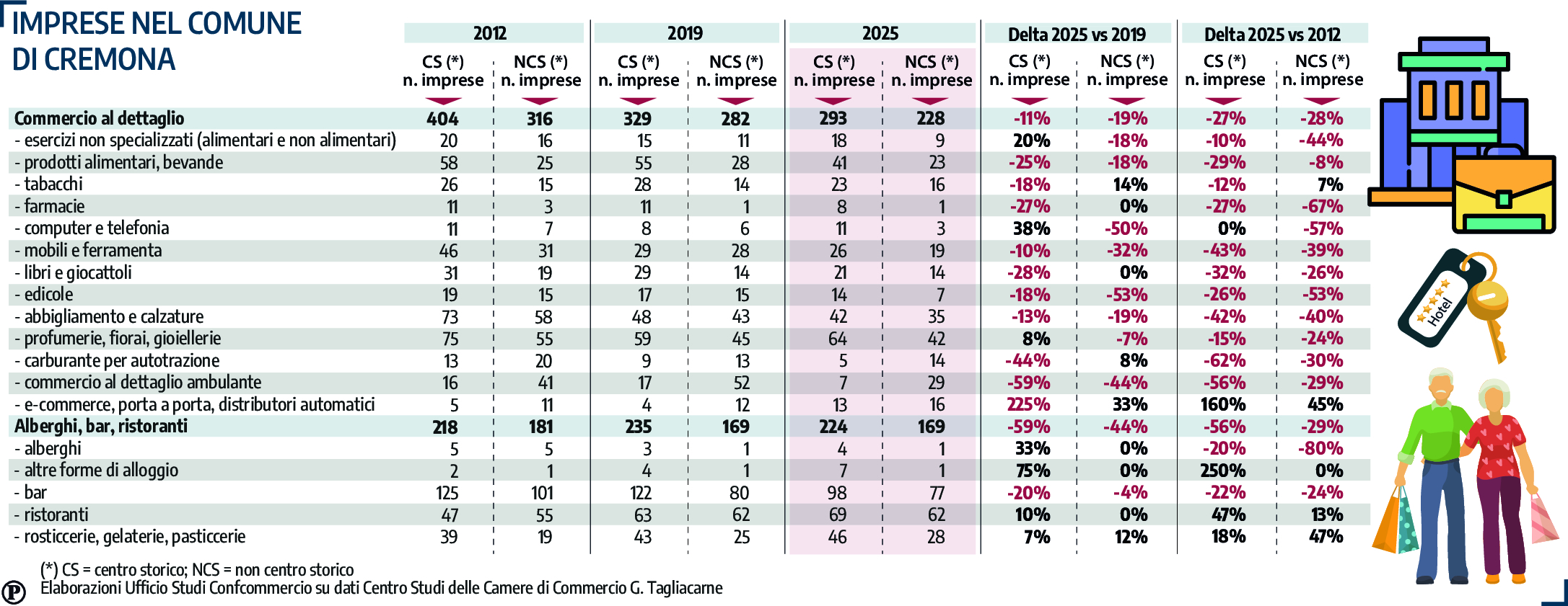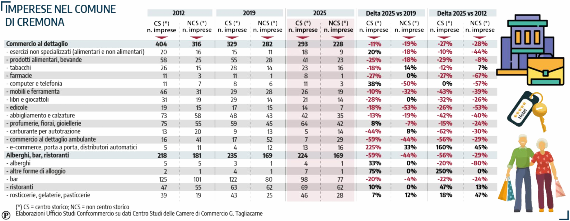 L’analisi evidenzia inoltre come la contrazione del commercio sia più marcata nei centri storici, dove il calo riguarda in particolare alcune categorie tradizionali. Tra il 2012 e il 2025, ad esempio, si registra una forte diminuzione di edicole, negozi di abbigliamento, librerie e attività legate alla vendita di mobili e ferramenta. Al contrario, crescono alcune tipologie di servizi, tra cui ristoranti, pasticcerie e strutture di ospitalità diffusa come affitti brevi e bed&breakfast. Anche la Lombardia segue questa tendenza, con una riduzione significativa degli esercizi commerciali tradizionali nei centri urbani e una progressiva trasformazione del tessuto economico verso attività di servizio, turismo e ristorazione.