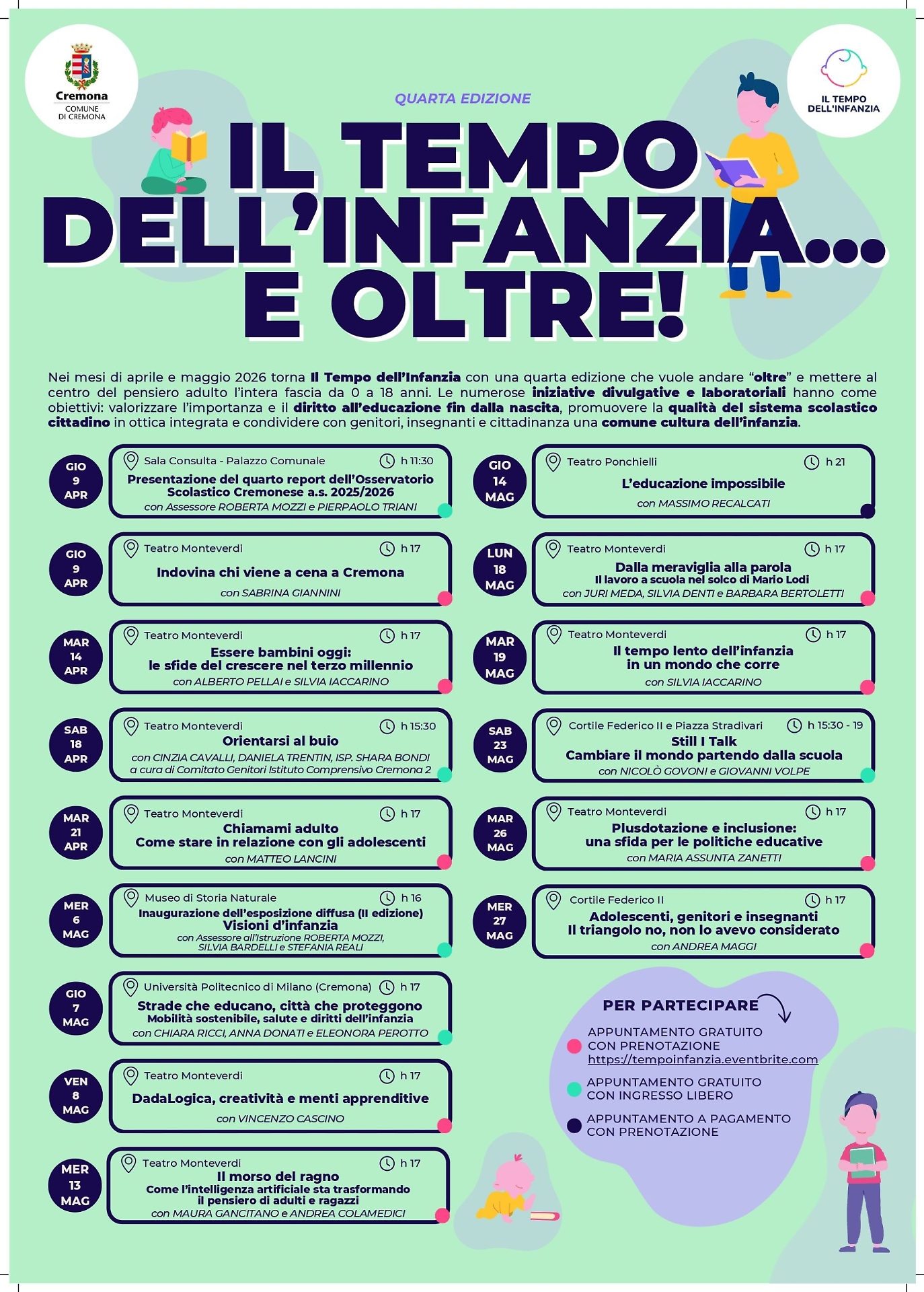 La rassegna si apre giovedì 9 aprile al Teatro Monteverdi con Indovina chi viene a cena a Cremona insieme alla giornalista Sabrina Giannini. Il 14 aprile sarà la volta di Essere bambini oggi con Alberto Pellai e Silvia Iaccarino, in dialogo per riflettere sulle sfide del crescere nel terzo millennio. Il programma prosegue con temi centrali per la contemporaneità: il rapporto con gli adolescenti con Matteo Lancini - Chiamami adulto – in programma il 21 aprile, il modello pedagogico DadaLogica presentato da Vincenzo Cascino, l’intelligenza artificiale e le trasformazioni del pensiero con Maura Gancitano e Andrea Colamedici (Il morso del ragno, 13 maggio), la scuola di Mario Lodi tra infanzia e primaria con Juri Meda, Silvia Denti e Barbara Bertoletti (18 maggio), Il tempo lento dell’infanzia in un mondo che corre con Silvia Iaccarino (19 maggio) fino alle questioni della plusdotazione e dell’inclusione con Maria Assunta Zanetti (26 maggio), per concludere con Andrea Maggi, noto per il docureality della Rai «Il Collegio» con un incontro dal titolo Adolescenti, genitori e insegnanti. Il triangolo no, non lo avevo considerato (27 maggio).