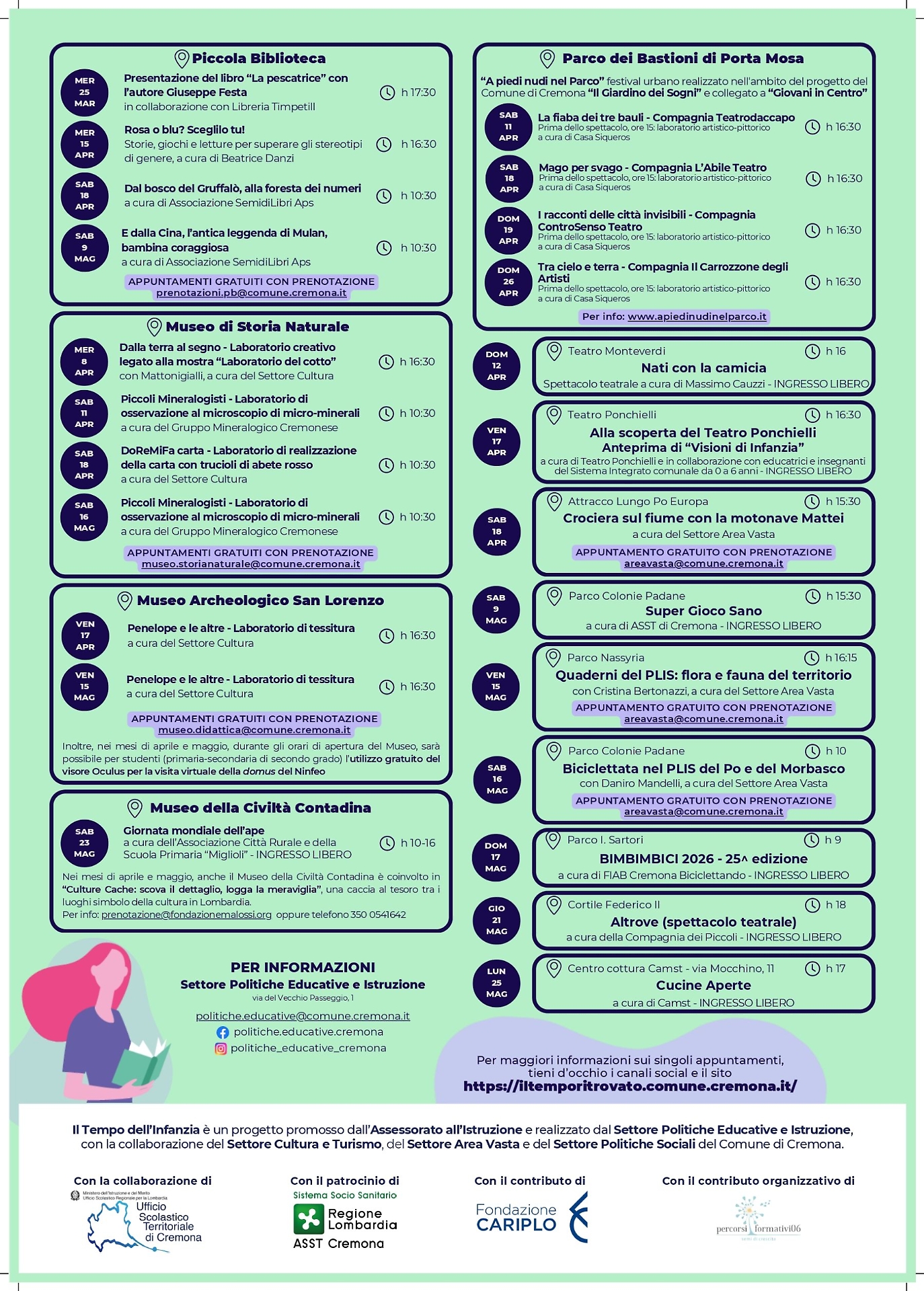 Tra gli appuntamenti anche la presentazione del quarto report dell’Osservatorio Scolastico Cremonese per l’anno scolastico 2025/2026 (9 aprile), un approfondimento sul cyberbullismo organizzato dal Comitato Genitori Istituto Comprensivo Cremona 2 con Roberta Cavalli, Daniela Trentin e l’ispettore Shara Bondi (18 aprile), l’inaugurazione della seconda edizione di Visioni d’infanzia (6 maggio, al Museo di Storia Naturale e in anteprima il 17 aprile al Teatro Ponchielli), l’incontro dedicato alla mobilità sostenibile e ai diritti dell’infanzia a cura di Chiara Ricci, Anna Donati ed Eleonora Perotto, organizzato con Fiab Biciclettando, Politecnico di Milano sede di Cremona e UNICEF (7 maggio), e la giornata di presentazione del progetto Still I Rise con Nicolò Govoni e Giovanni Volpe in Cortile Federico II e in piazza Stradivari (23 maggio).
