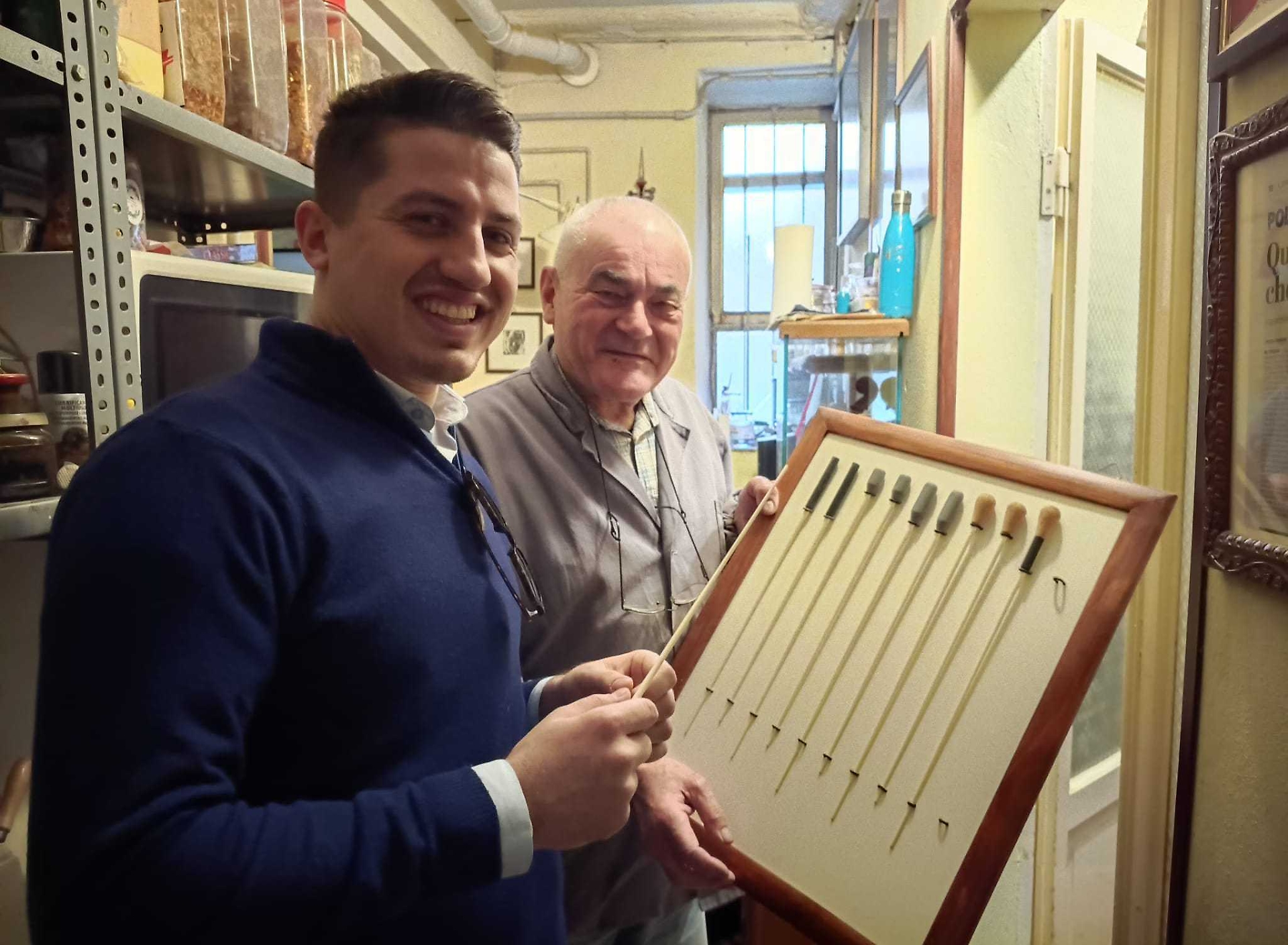 Stefano Conia, insieme al figlio Stefano jr., sorride e ascolta mentre cura la messa a punto degli strumenti, cercando la posizione giusta di ponticello e mentoniera per mettere a proprio agio i musicisti. «È bello poter mettere a disposizione dei giovani i propri strumenti — afferma Conia senior —. Questo dà senso alla nostra attività, alle ore passate chini sul banco di lavoro. Se con il nostro mestiere possiamo aiutare i giovani talenti a esprimersi, siamo felici». Mentre parla, invita Harlen Nicoli a seguirlo e gli mostra un pannello con alcune bacchette da direttore, regalandogliene una. Nicoli lo guarda con riconoscenza e stupore. È nata un’amicizia.